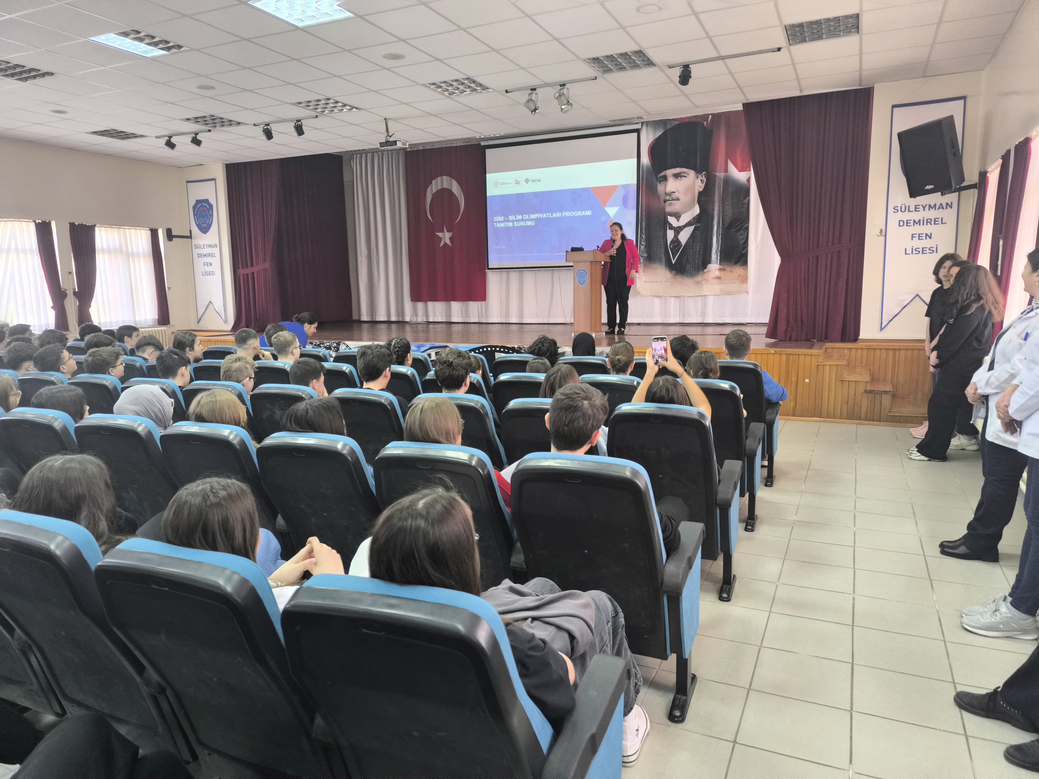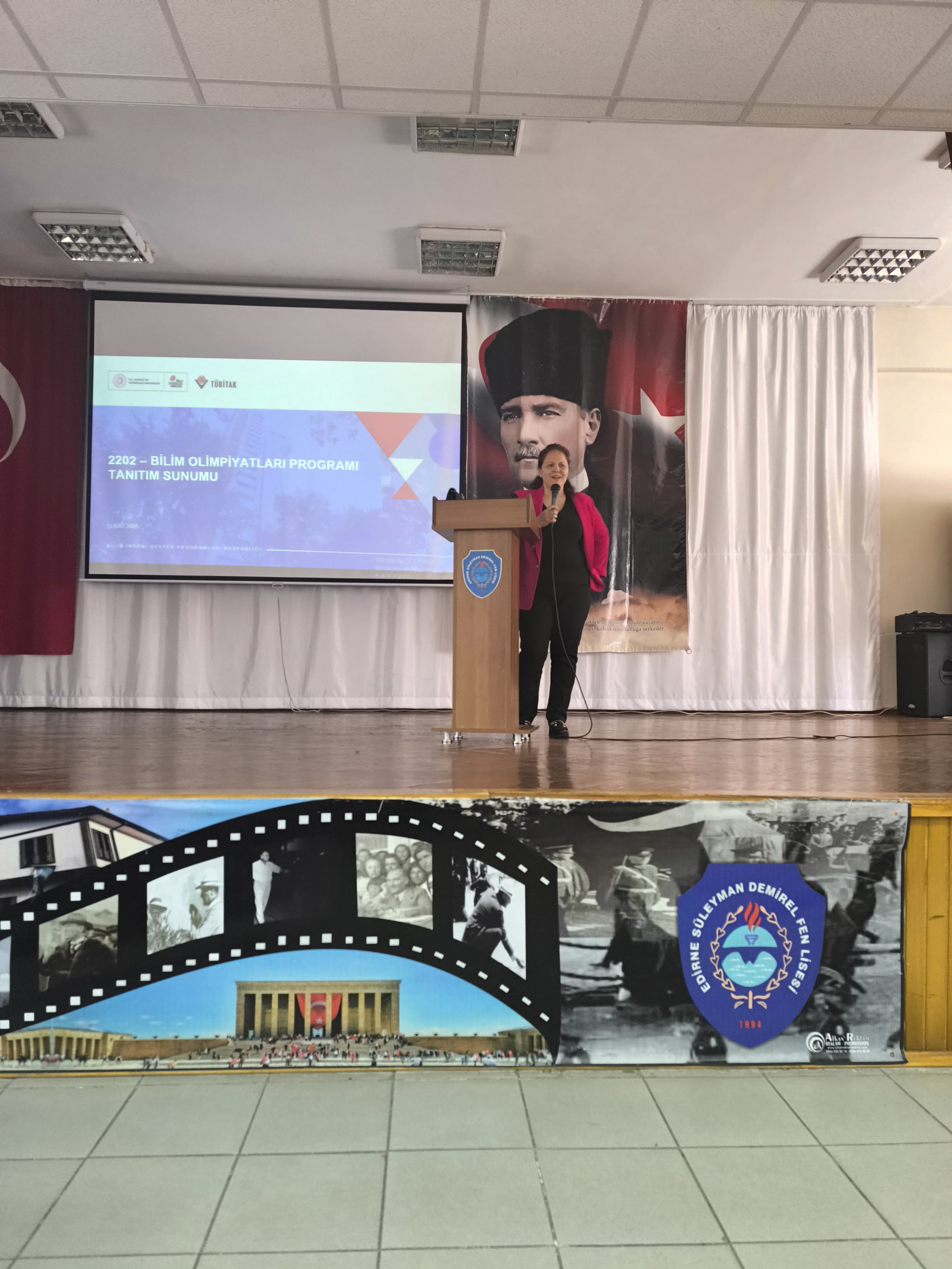 Edirne İl Milli Eğitim Müdürlüğü Genç AR-GE faaliyetleri kapsamında, bilimsel farkındalığı artırmak ve öğrencileri akademik başarıya yönlendirmek amacıyla önemli bir etkinlik daha hayata geçirildi. TÜBİTAK Avrupa Bölgesi Bilim Elçisi Pınar ÖZDEMİR, 16 Nisan 2025 tarihinde Edirne Süleyman Demirel Fen Lisesi ve Edirne Lisesi'nde öğrencilerle buluşarak TÜBİTAK 2202 Bilim Olimpiyatları hakkında bilgilendirici seminerler verdi.